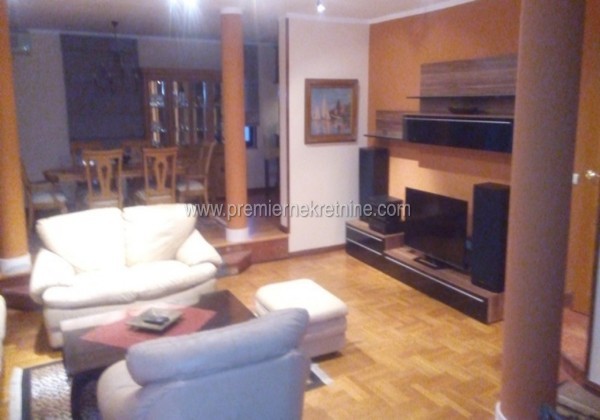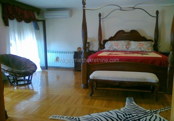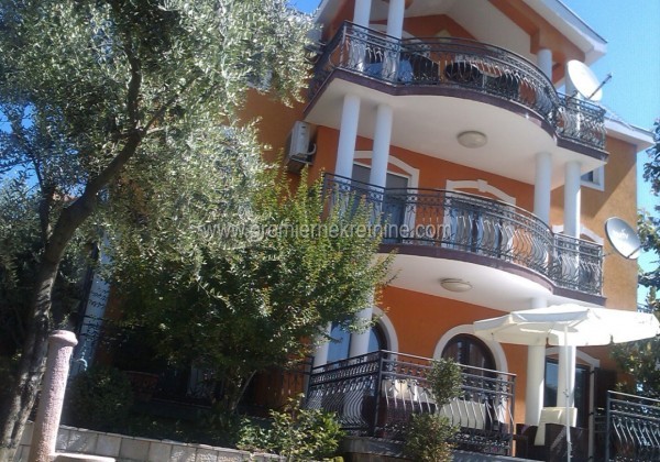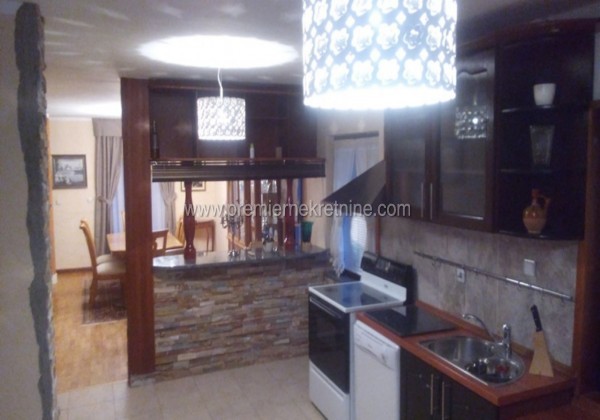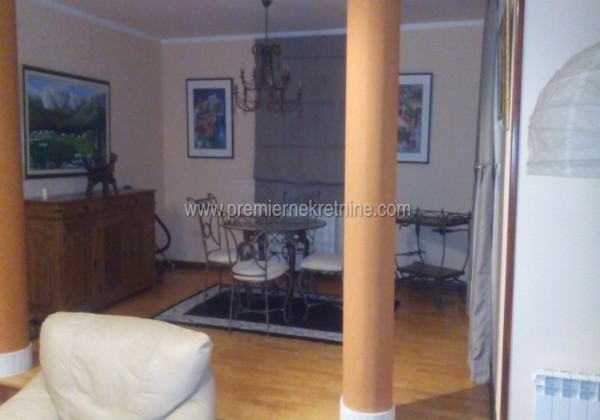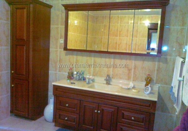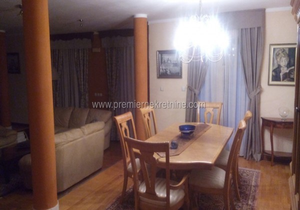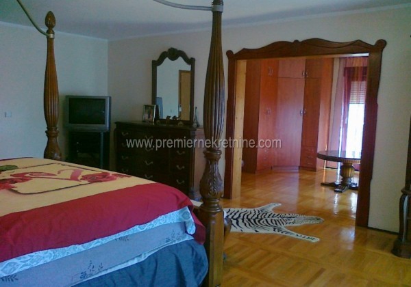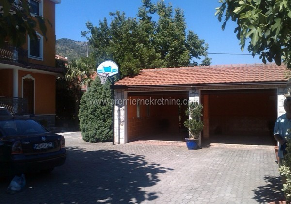 - kuca je: prizemlje i prvi sprat (jedan stan) 380m² plus podrum 160m² i zaseban apartman-stan na II spratu 180m² na placu od 1500m² lux in and out Stan je u potkrovlju 180m2: 3 sobe, 2 kupatila, toalet, vešeraj, 2 terase i dnevni boravak, trpezarija i kuhinja. Veći stan (oko 380m2) je prizemlje i sprat: 7 soba, 4 kupatila, toalet, vešeraj, 7 terasa, dnevni boravak, trpezarija, kuhinja i špajz. Podrum je cijelom površinom kuće sa kupatilom, konobom, garažnim ulazom i prostorom sa centralnim grijanjem, malom teretanom. Pored kuće se nalazi dupla garaža 60m2 sa ostavom i roštiljem. U dvorištu sa hortikulturama se nalazi ljetnjikovac. '. Takođe centralno je grijanje u kući na sva goriva.