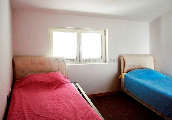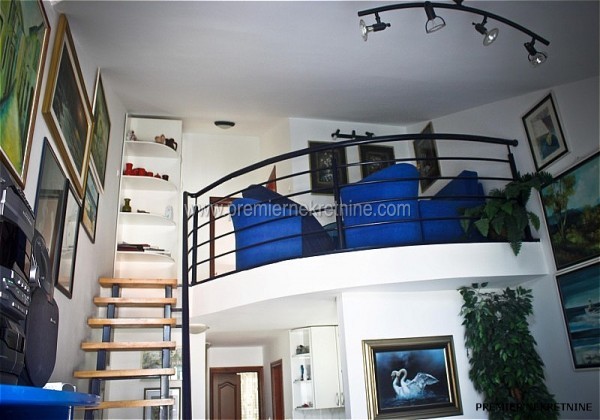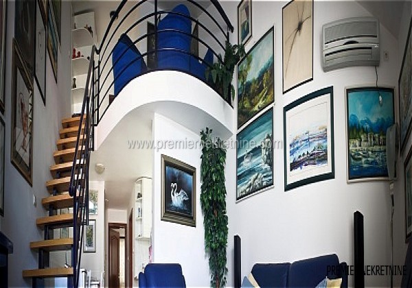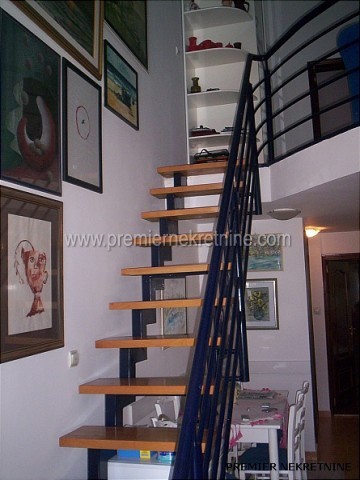 - Stan je na dvije etaze, a na donjoj etazi je ulazni hodnik zatim spavaca soba sa svojom lodjom, kupatilo, trpezarija, kuhinja, velika dnevna soba sa velikom terasom koja ima trajan pogled kao sto moze da se vidi sa slika, a na gornjoj etazi je hodnik zatim mala galerija na kojoj ima mogucnost razvlacenja kreveta tako da i tu moze dvoje da spava, kupatilo i velika spavaca soba sa svojom lodjom. Stan ima parking koji ulazi u cijenu, a cijena stana je 195.000,00e.