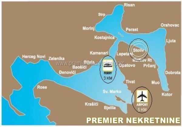 - Kuca (104m2) se nalazi na placu povrsine 813m2 u Stolivu (izmedju Tivta i Kotora) na samoj obali mora. Stoliv je malo mjesto idealno za odmor. To je miran i tih region idealan za relaksaciju i bjeg od svakodnevnog zivota. Iz kuce se pruza prelijep pogled na Perast i dva ostrva - Gospa od Skrpjela i Sveti Djordje. Kuca ima prizemlje, prvi sprat i tavan, sopstvenu pontu, bunar, garazu, dvije terase. Na jednoj terasi je ozidani rostilj. Prizemlje: dvije spavace sobe, kuhinja, dnevni boravak i kupatilo. Prvi sprat: tri spavace sobe, terasa i kupatilo. Tavan. Vlasnistvo 1/1 Dozvoljena gradnja