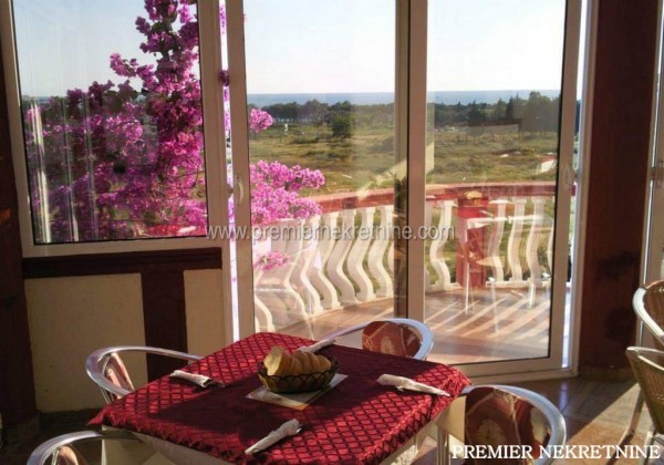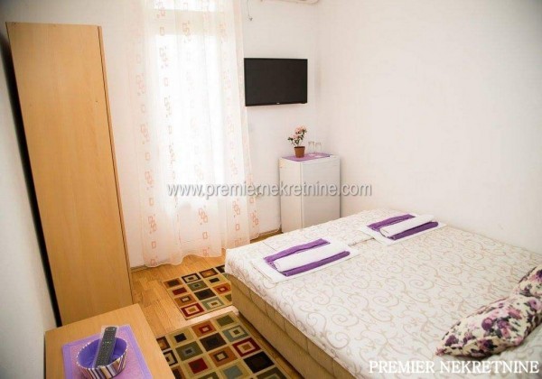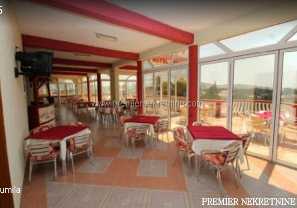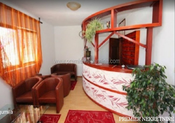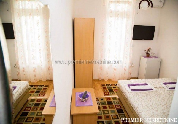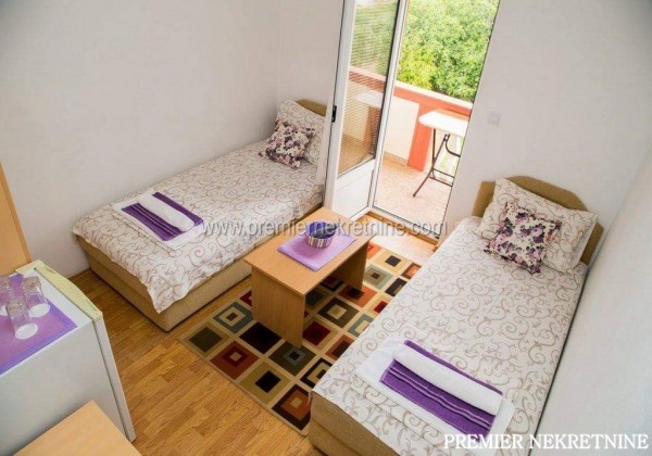 - Povrsina objekta je cca 1.000m2, povrsina placa 400m2. Na prizemlju su dva trosobna stana od po 96m2 (od kojih je jedan preuredjen u recepcijski dio i sobe sa osoblje). Na prvom i drugom spratu su 24 sobe sa kupatilima i balkonom (nisu apartmani vec klasicne manje hotelske sobe). Na trecem spratu je restoran sa kuhinjom i na vrhu je otvorena terasa sa lezaljkama. Dobijeni su urbanisticko-tehnicki uslovi i projektna dokumentacija je ovjerena na 500m2, komunalije treba da se plate. Objekat je ranije radio registrovan kao hotel i kao pansion, sada se izdaje agenciji. Objekat udaljen od obale mora. 500m